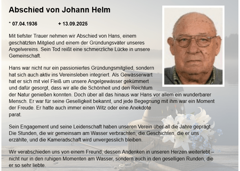 Mit tiefster Trauer nehmen wir Abschied von Hans, einem geschätzten Mitglied und einem der Gründungsväter unseres Angelvereins. Sein Tod reißt eine schmerzliche Lücke in unsere Gemeinschaft.